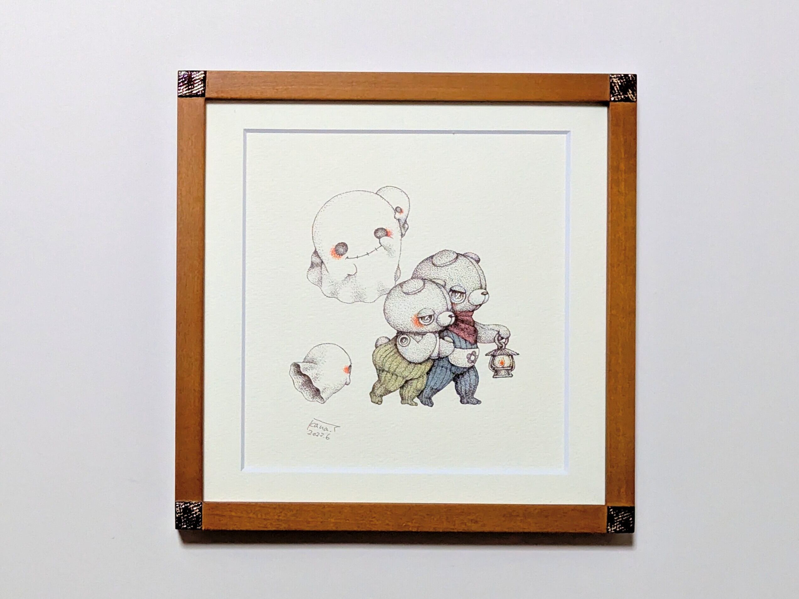 怖いけど二人なら 画材:ボールペン(シグノ)、水彩紙、顔彩絵の具 サイズ:約22.7cm×22.7cm(額装込み) 額装:木、アクリル [取り扱いについて] 飾る際には直射日光を避けていただき、保管する際には高温多湿を避けて暗所に保管をお願いします。 特に、直射日光が当たると退色が早く、長く作品を楽しめなくなる可能性がございます。
