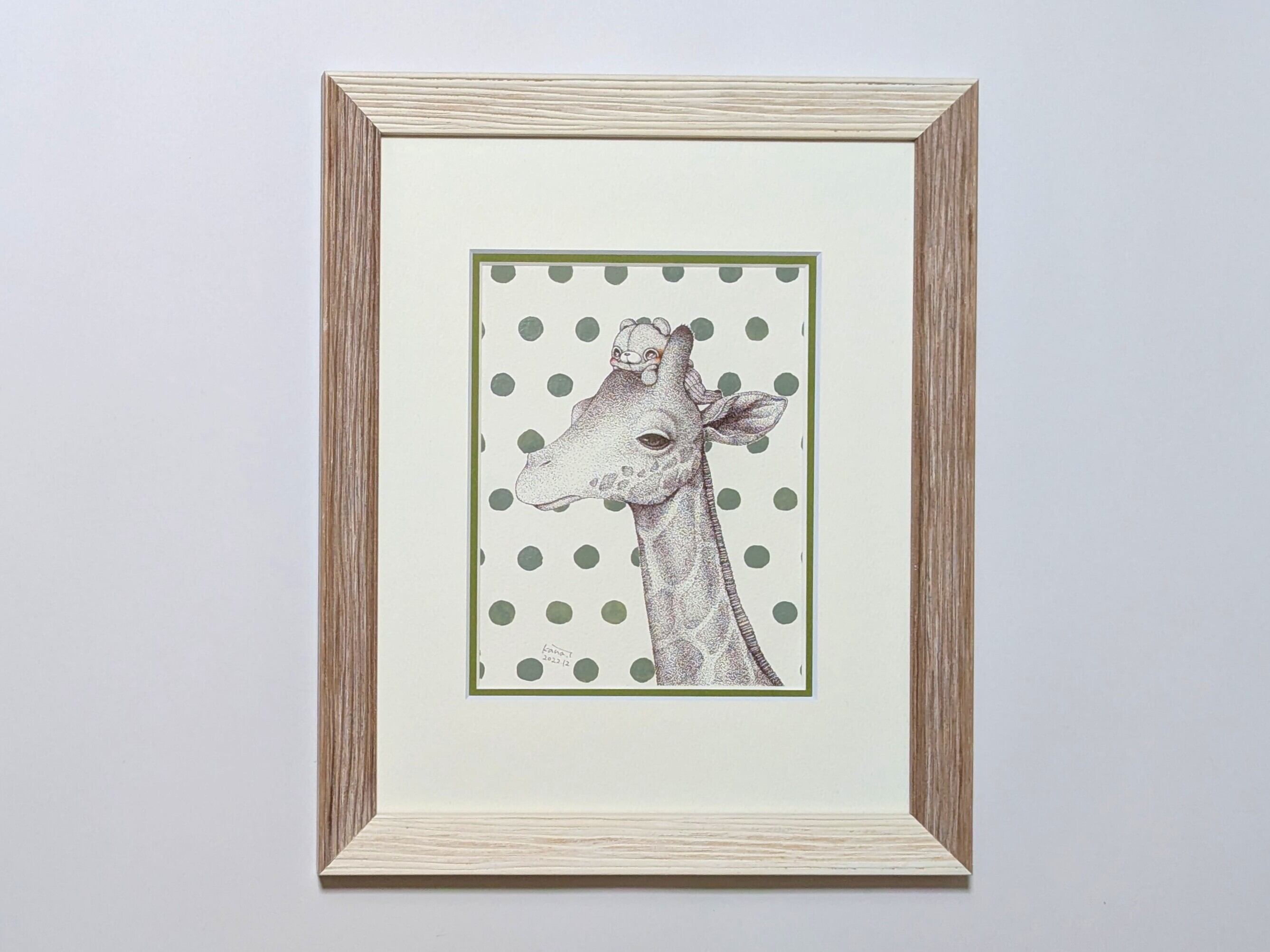 いつもより良く見えるね 画材:ボールペン(シグノ)、水彩紙、顔彩絵の具 サイズ:約28cm×34cm(額装込み) 額装:木、アクリル [取り扱いについて] 飾る際には直射日光を避けていただき、保管する際には高温多湿を避けて暗所に保管をお願いします。 特に、直射日光が当たると退色が早く、長く作品を楽しめなくなる可能性がございます。